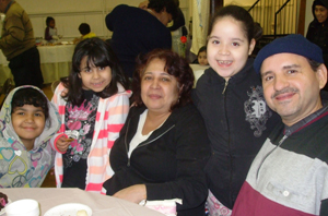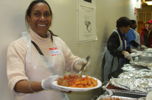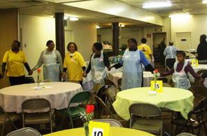 400 guests were hosted by 30 volunteers who served them food in formal "restaurant style" according to their numbered tables. The delectable meal featured a menu of penne pasta with meatballs, herb spiced chicken with vegetable rice, salad, rolls, coffee, tea, cake and cookies.