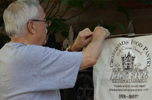 Ed Reigadas hangs the Crossroads banner signifying the Pantry is open.