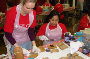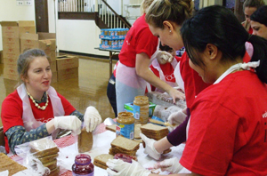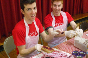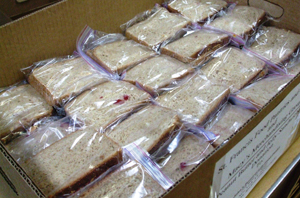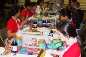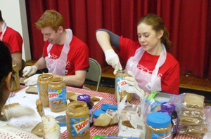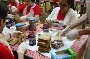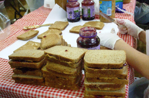 Let the "PB&J Sandwich Making" games begin! | These volunteers are off to a great start. |